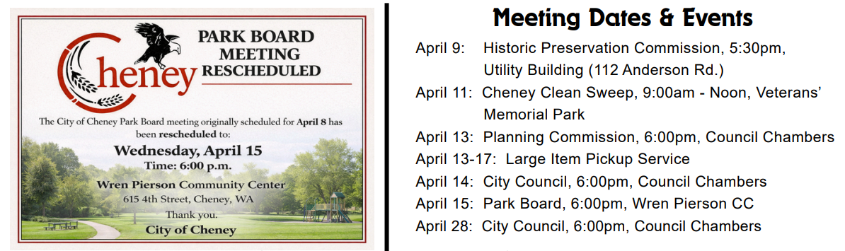 As always, you can find a condensed preview of upcoming meetings in the Cheney Connections city newsletter, which arrives with your paper utility bill and is also posted on the city website. One note worth calling out: the list there is a bit out of date at this point. The Park Board meeting was originally rescheduled from the first Wednesday of the month to April 15th, but has since been cancelled.