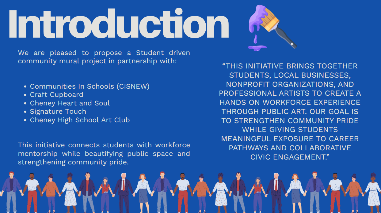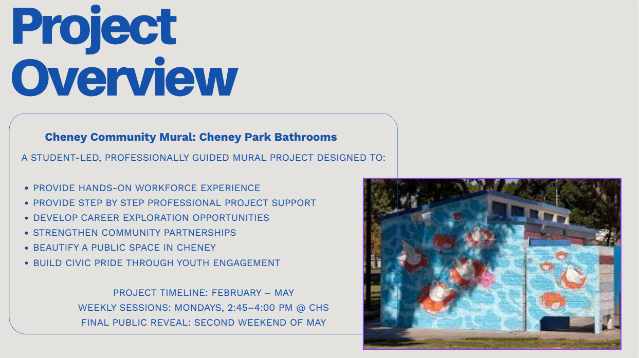 Veterans Park Mural - This is a project being pursued as a collaboration of Communities in Schools, Cheney Heart & Soul, local business Craft Cupboard via Macey Fredenburg and local artist Sierra Athos. The idea is to work with high school students to paint a mural on the restroom in Veteran's park. The work would be overseen by a local artist at all times. Expected cost is $1k, but there is expected fundraising as part of the program. The mural would reflect it's location and have Veteran's theme to honor our Veterans. Personally, I think this is a great collaboration to bring some art into our community, give students real world experience and honor our veterans. I'm hoping it can be extended in the future to other restrooms within our parks system. Here are some screen shots from the presentation: