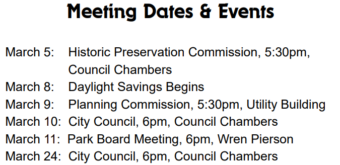 As mentioned, a major focus for the City this month is hiring a permanent Police Chief and City Administrator. Both positions are appointed by Mayor Martin and then come before Council for confirmation. Police Chief candidate interviews took place on March 3, and the timing of the final selection will determine which Council meeting the confirmation appears on, ideally one of the March meetings.